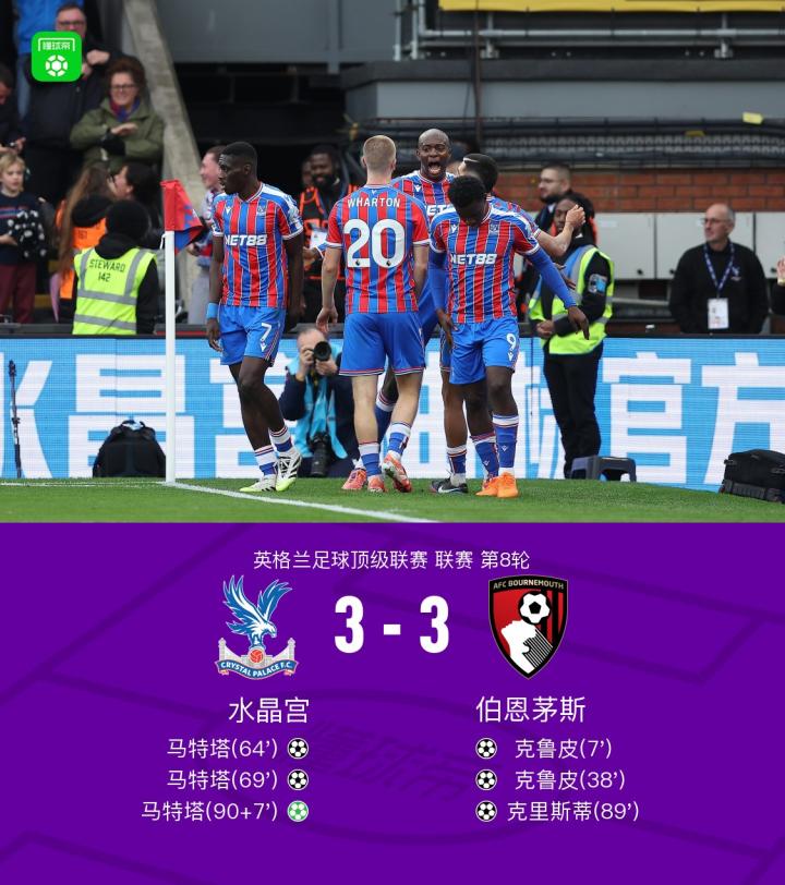 北京时间10月18日晚,英超联赛第8轮展开激烈角逐,水晶宫坐镇主场迎战伯恩茅斯。本场比赛中,水晶宫的马特塔上演帽子戏法,伯恩茅斯则由克鲁皮梅开二度,克里斯蒂也有一球入账。最终,双方以3-3的比分握手言和。