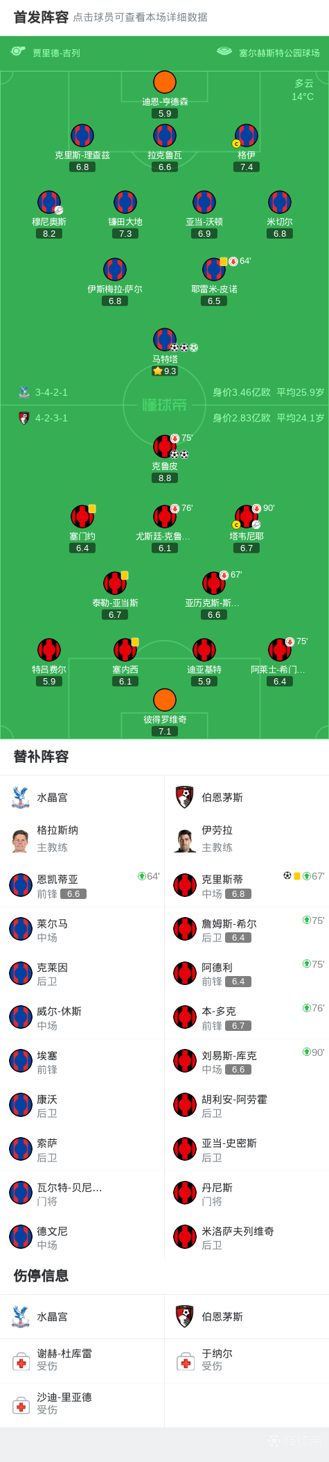 水晶宫3-3伯恩茅斯, 马特塔帽子戏法,克鲁皮双响